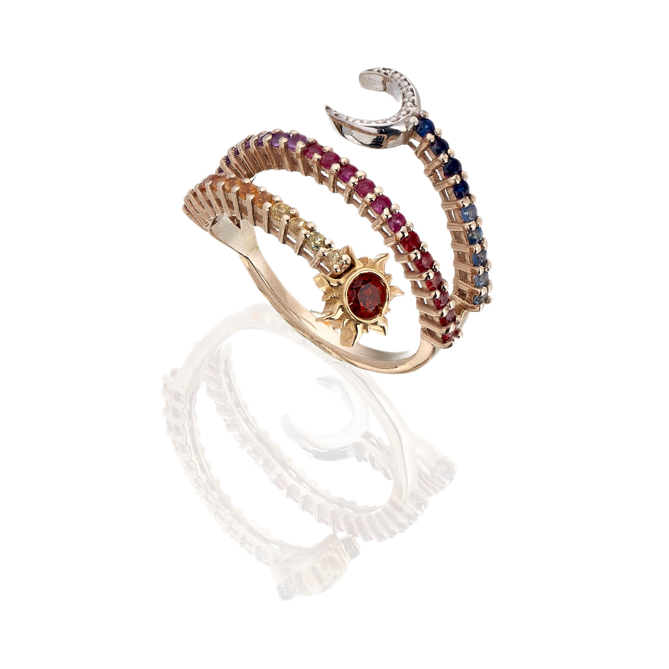 Anel Cores do Céu feito em ouro 18k, citrino de 3mm um mix de gemas coloridas- rubis, citrinos, safiras, topázios, rubelitas.
