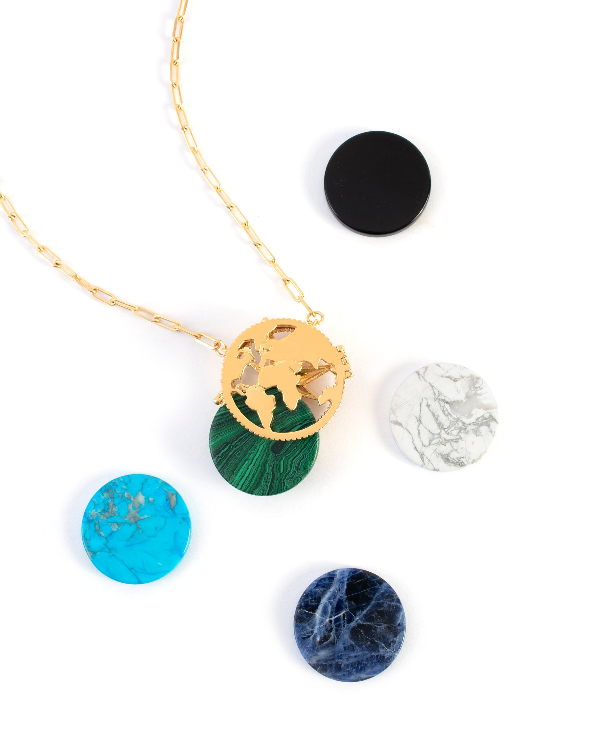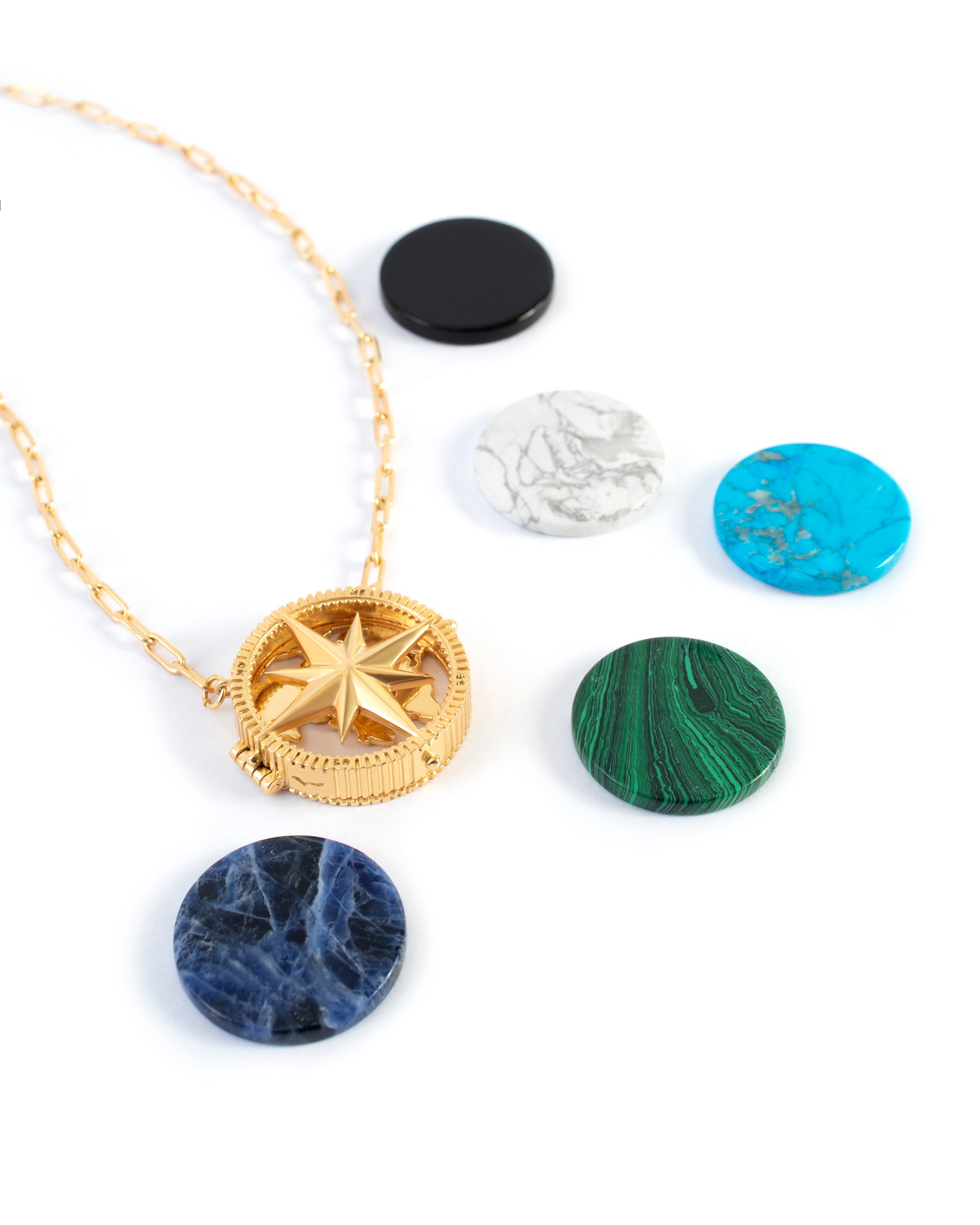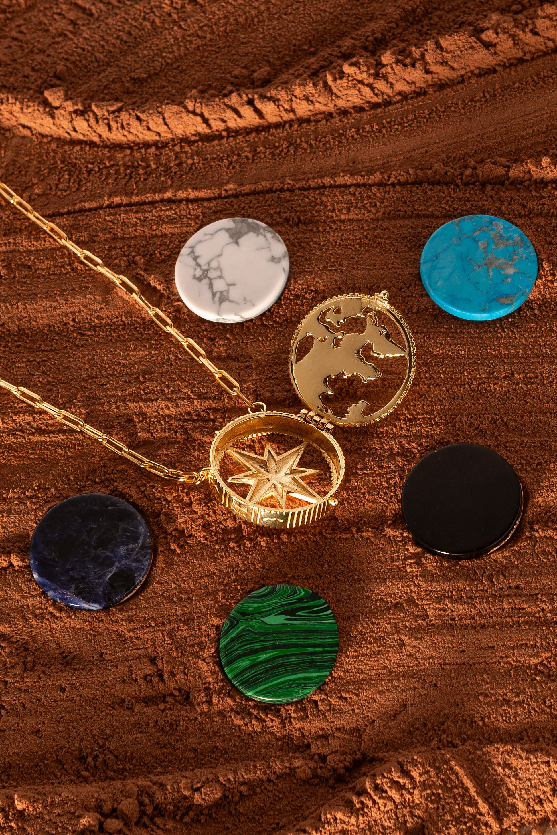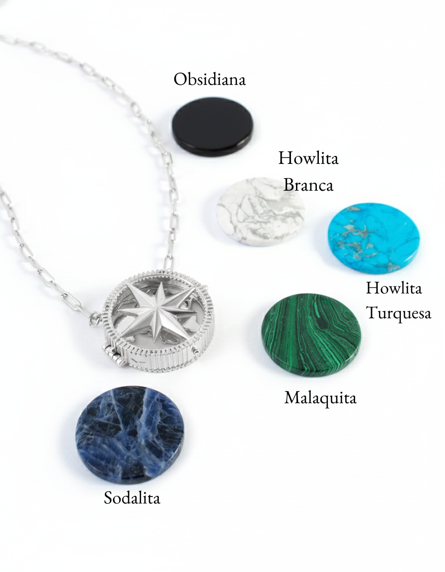 Seu design engenhoso em formato de relicário permite a troca fácil das pedras naturais, garantindo que você tenha um colar totalmente novo em segundos para combinar com qualquer look. A peça é dupla face, trazendo a icônica Rosa dos Ventos de um lado e o Mapa Mundi do outro, um convite constante à descoberta.