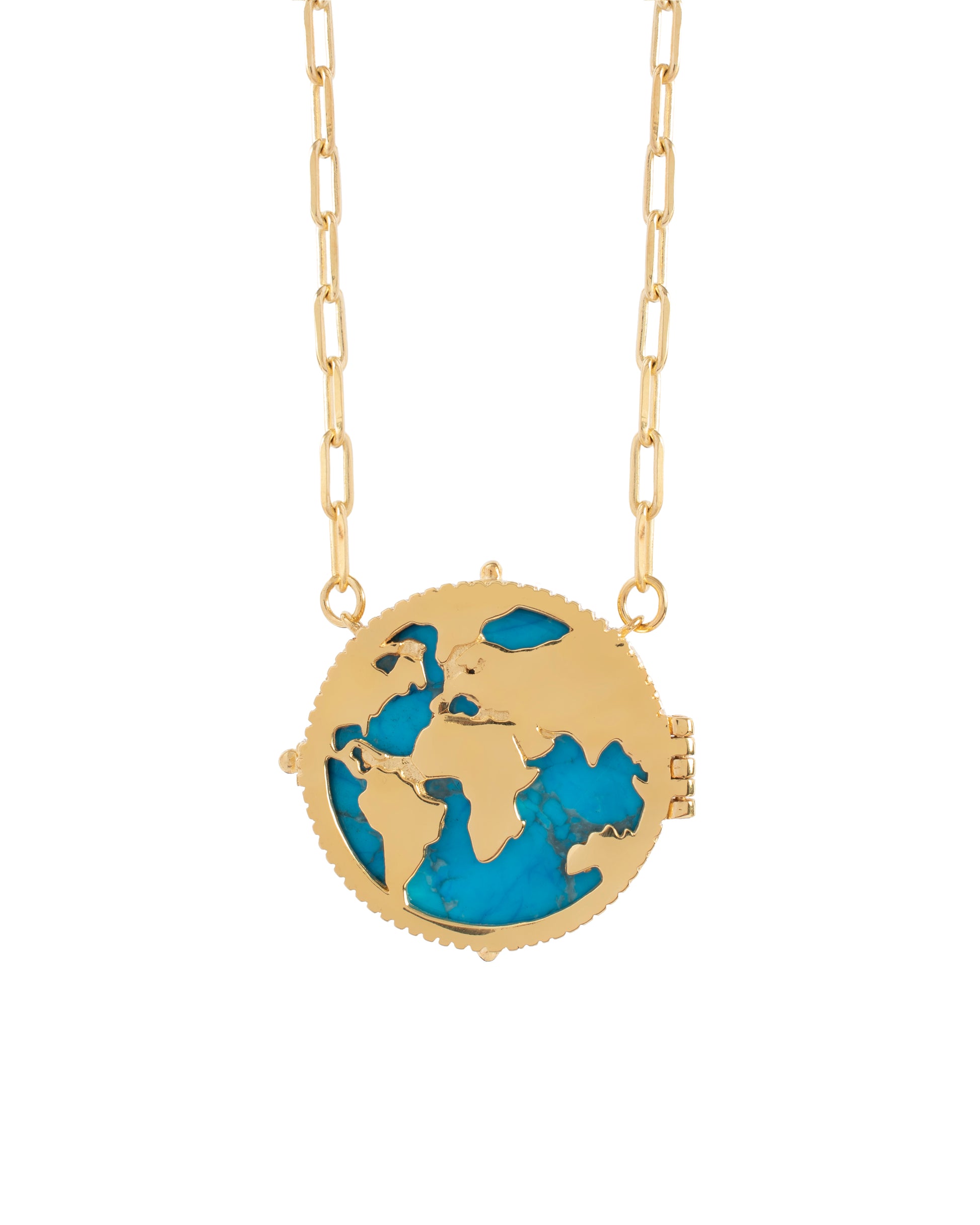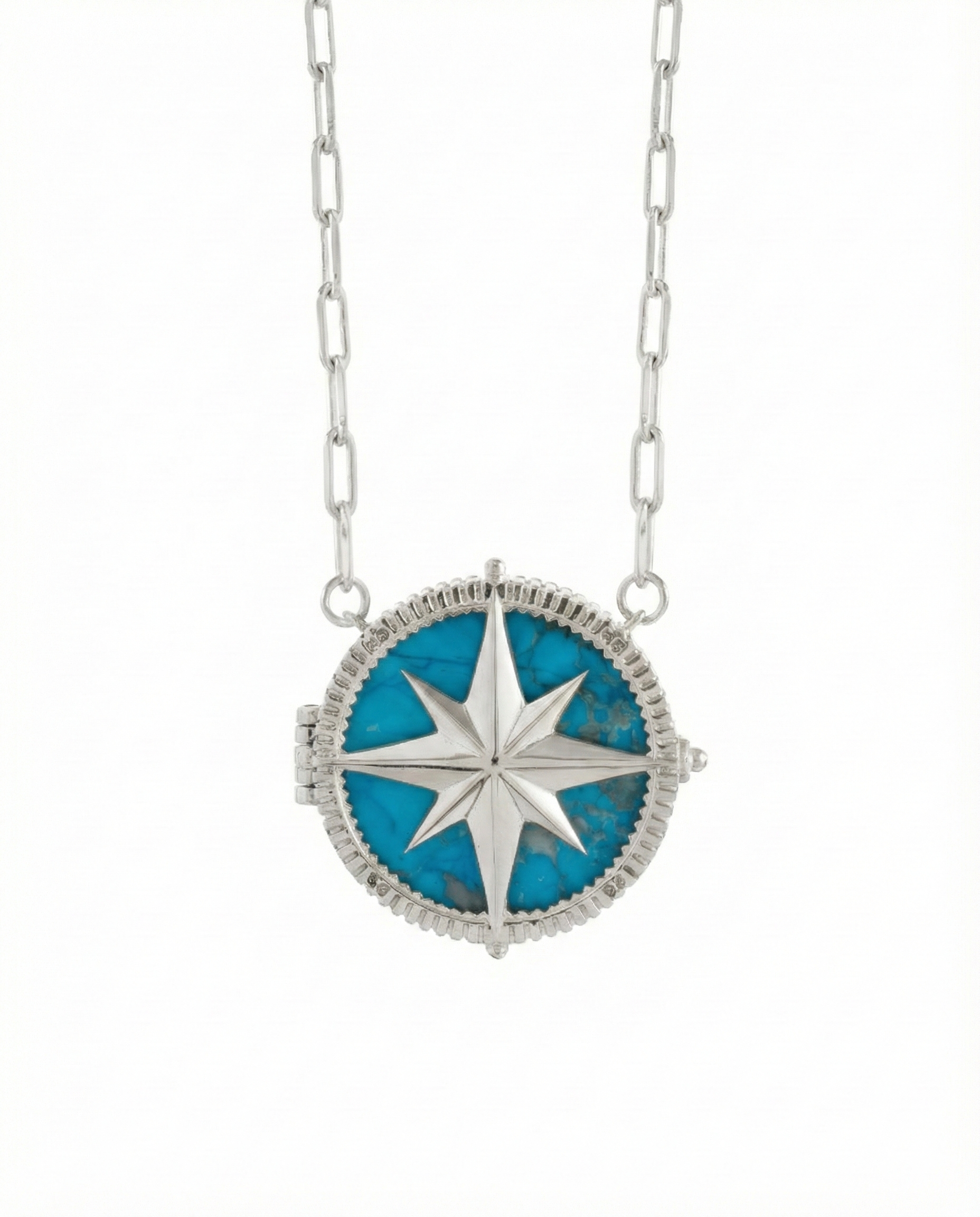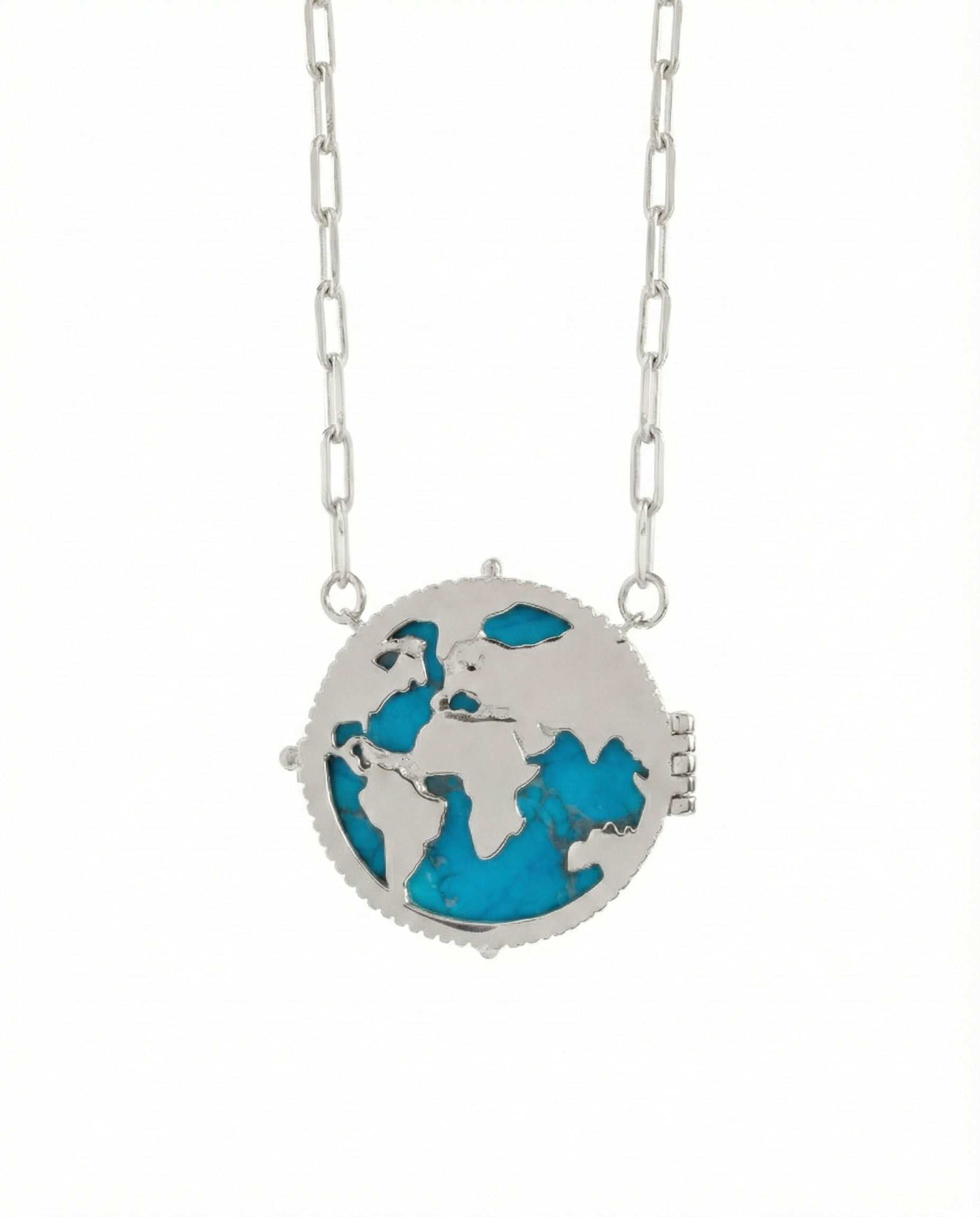 Seu design engenhoso em formato de relicário permite a troca fácil das pedras naturais, garantindo que você tenha um colar totalmente novo em segundos para combinar com qualquer look. A peça é dupla face, trazendo a icônica Rosa dos Ventos de um lado e o Mapa Mundi do outro, um convite constante à descoberta.